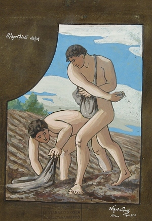 In: Falképtervek, figurális kompozíciók (16. mappa) Adatok: grafika, 1 db, rajz, 317x240 mm, zöld papír, tempera