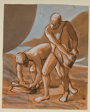 In: Falképtervek, figurális kompozíciók (16. mappa) Adatok: grafika] :, 1 db, akvarell, 228x188 mm, narancssárga papír, vízfesték