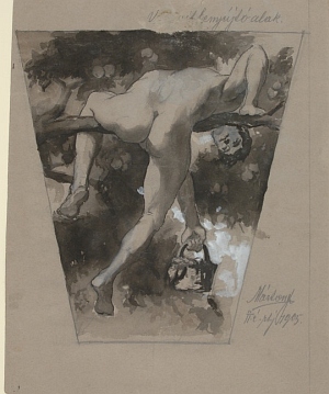 In: Falképtervek, figurális kompozíciók (16. mappa) Adatok: grafika, 1 db, akvarell, 245x225 mm (trapéz alakú), szürke papír, 348x257 mm, vízfesték