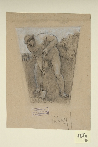 Ásó férfi In: Falképtervek, figurális kompozíciók (16. mappa) Adatok: grafika] :, 1 db, rajz, 241x211 mm (trapéz alakú), szürke papír, 370x268 mm, kréta és fedőfehér Információ: Tárgyszavak: Leltári szám: 16/09.b