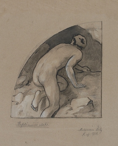In: Falképtervek, figurális kompozíciók (16. mappa) Adatok: grafika, 1 db, rajz, 361x307 mm (negyed körszelet alakú), szürke papír, kréta, akvarell