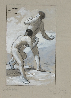 In: Falképtervek, figurális kompozíciók (16. mappa) Adatok: grafika, 1 db, rajz, 303x186 mm, zöld papír, 434x309 mm, kréta és fedőfehér