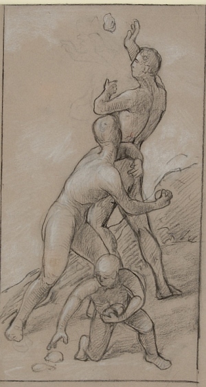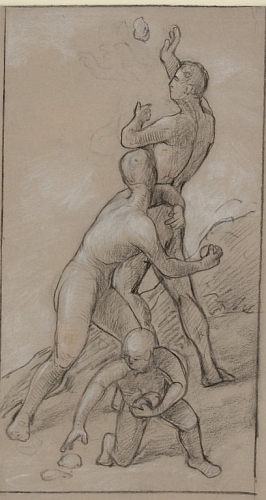 Követ dobáló ifjak In: Falképtervek, figurális kompozíciók (16. mappa) Adatok: grafika] :, 1 db, rajz, 300x176 mm, szürke papír, fekete és fehér kréta Információ: Tárgyszavak: Leltári szám: 16/16.b