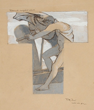 Valamit megkötő alak In: Falképtervek, figurális kompozíciók (16. mappa) Adatok: grafika, 1 db, rajz, 450x315 mm (T alakú képmezőben), papír, kréta és fedőfehér Információ: Tárgyszavak: Leltári szám: 16/24.a