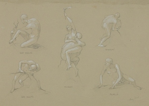 Alaktanulmányok In: Falképtervek, figurális kompozíciók (16. mappa) Adatok: grafika, 1 db, rajz, 302x449 mm, zöld papír, ceruza, fedőfehér Információ: Tárgyszavak: Leltári szám: 16/28