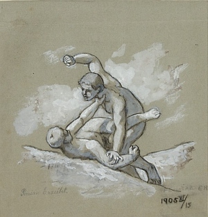 (b.l.) Perzsián Erzsébet, (j.l.) 1905. XI/15, (a kartonon, a rajz alatt) Küzdő alakok