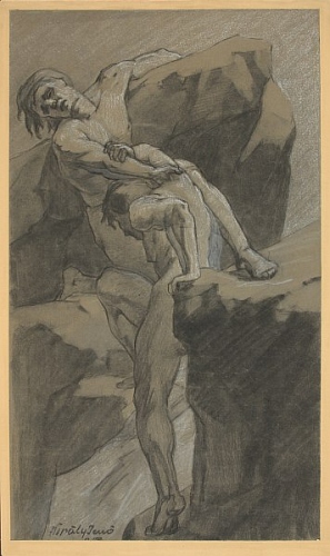 Szikláról leereszkedő, egymást segítő két férfi In: Alaktani kompozíciók (23. mappa) Adatok: grafika, 1 db, rajz, 370x330 mm, barna papír, szén, fehér kréta Információ: Tárgyszavak: Leltári szám: 23/112