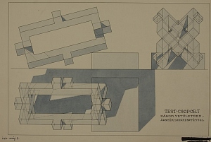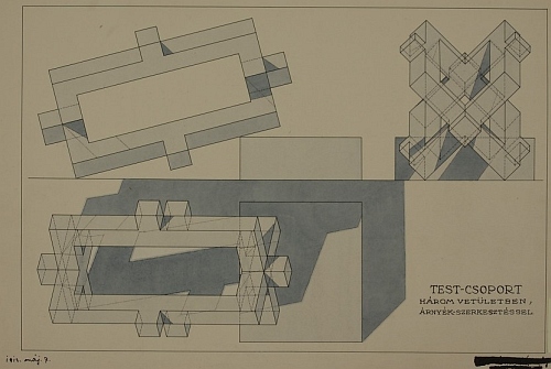 Jelezve (j.l.) Kovács Károly (átfestve), (b.l.) 1912. máj. 7., felirat tussal: Testcsoport három vetületben, árnyék-szerkesztéssel