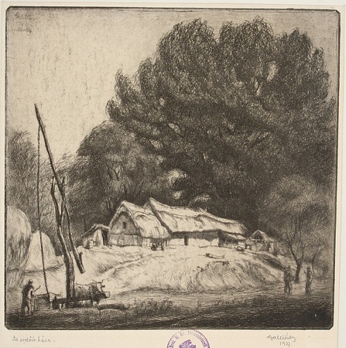A lemezen (b.f.) Gallé Tibor 1927 Mártély, aláírva (j.l.) Gallé Tibor 1927. (b.l.) Az erdőőr háza, (k.l.) a Rektori Hivatal körpecsétje