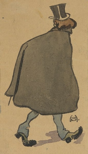 Köpenyes, cilinderes férfi hátulról