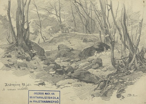 Jelezve (j.l.) B. E., (b.l.) leírás "Zebegény 92. jul. 1. A marosi erdőből" (l.) az Orsz. M. Kir. Képzőművészeti Főiskola bélyegzője