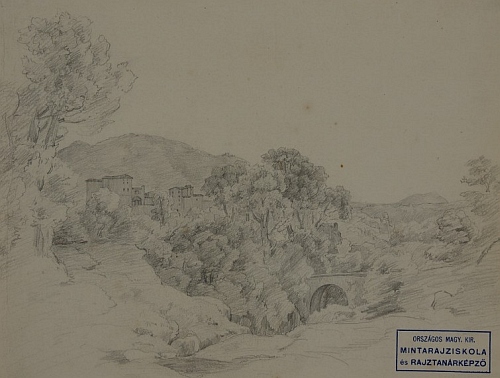 Erdőrészlet kőhíddal és néhány kőházzal