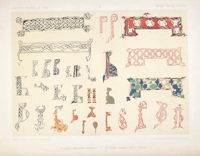 II. tábla. L'Ornement slave et oriental d'apres les manuscrits anciens et modernes. Saint-Pétersbourg : Publié avec autorisation de sa Majesté l'Empereur Alexandre II - établissement Cartographique De M. Illine, 1887.