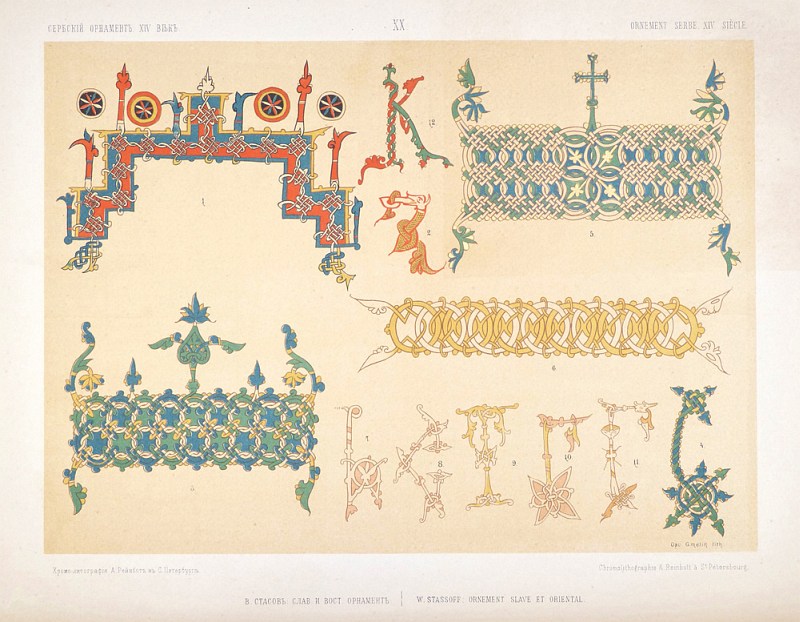 XX. tábla. L'Ornement slave et oriental d'apres les manuscrits anciens et modernes. Saint-Pétersbourg : Publié avec autorisation de sa Majesté l'Empereur Alexandre II - établissement Cartographique De M. Illine, 1887.