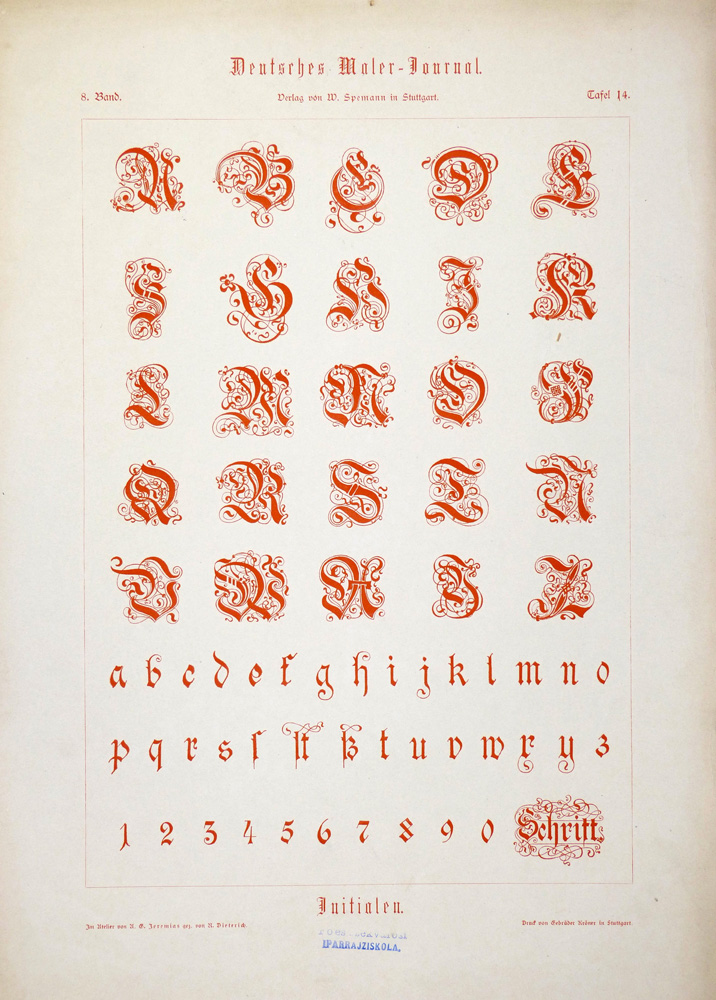 8. Band, Tafel 14. Deutsches Maler-Journal : Plafonds, Vestibule, Treppenhauser, Wanddecorationen, Sgraffiten, Holz- und Marmor-Malerei, Blumen, Alphabete, Schilder, Embleme, Plakate etc. Stuttgart : W. Spemann, [1877-18 94]